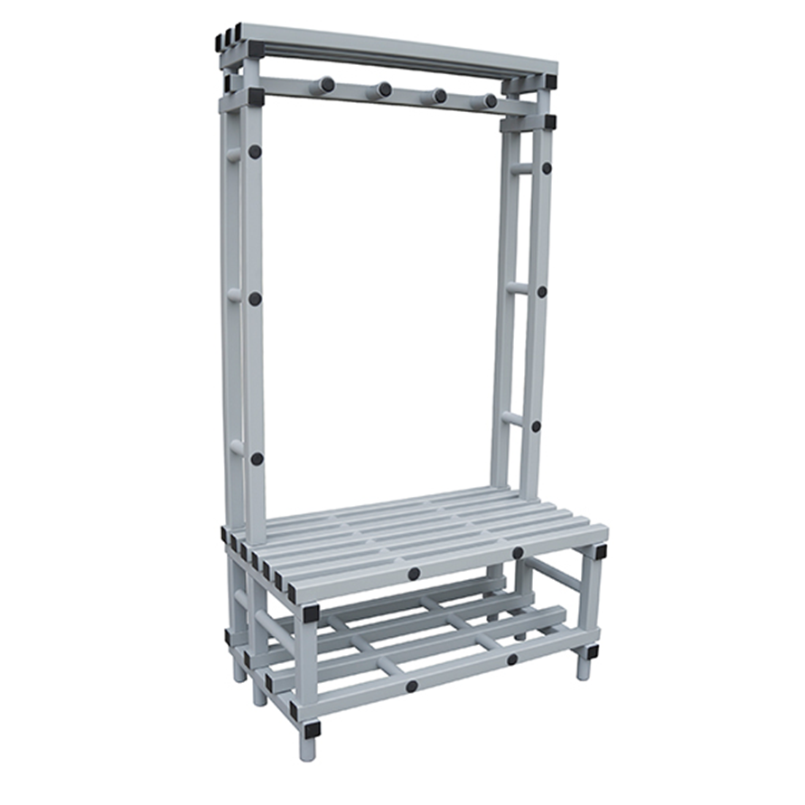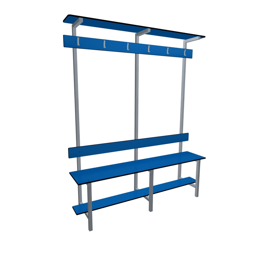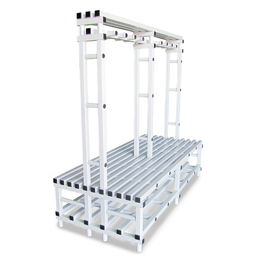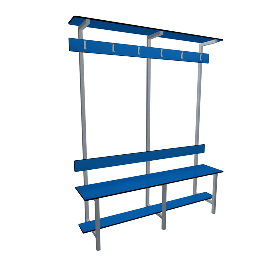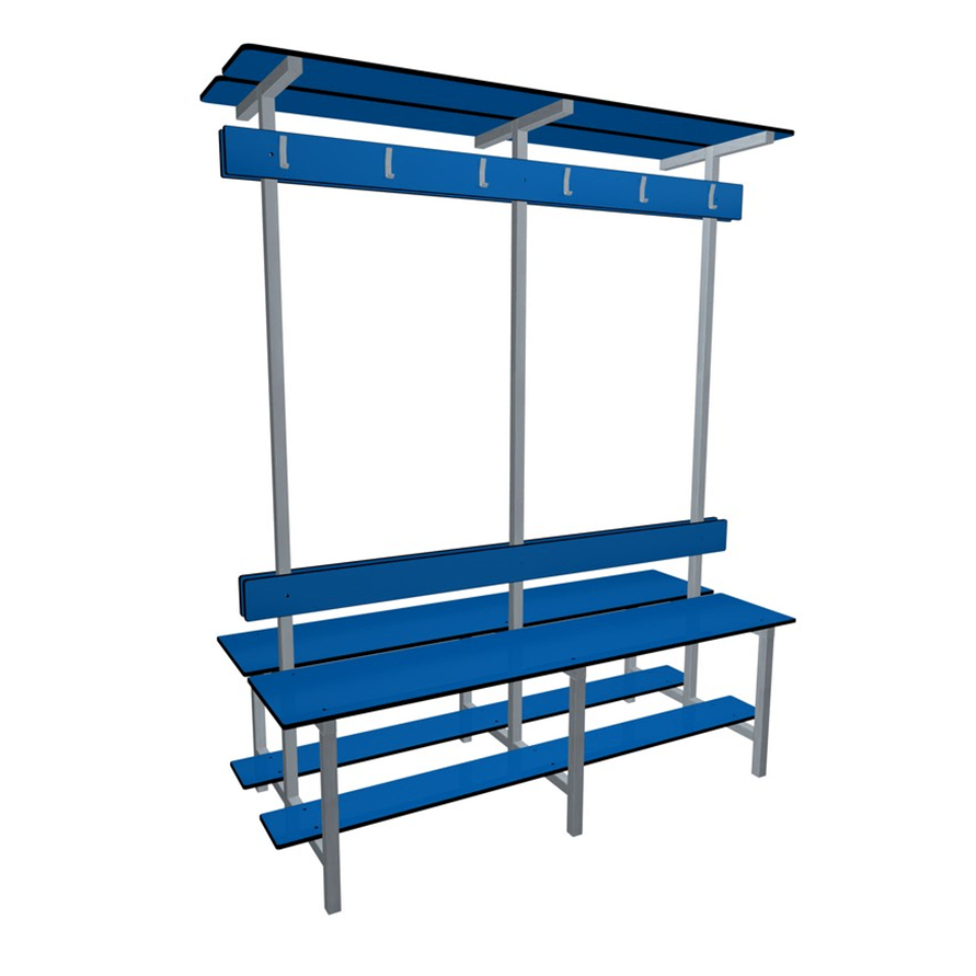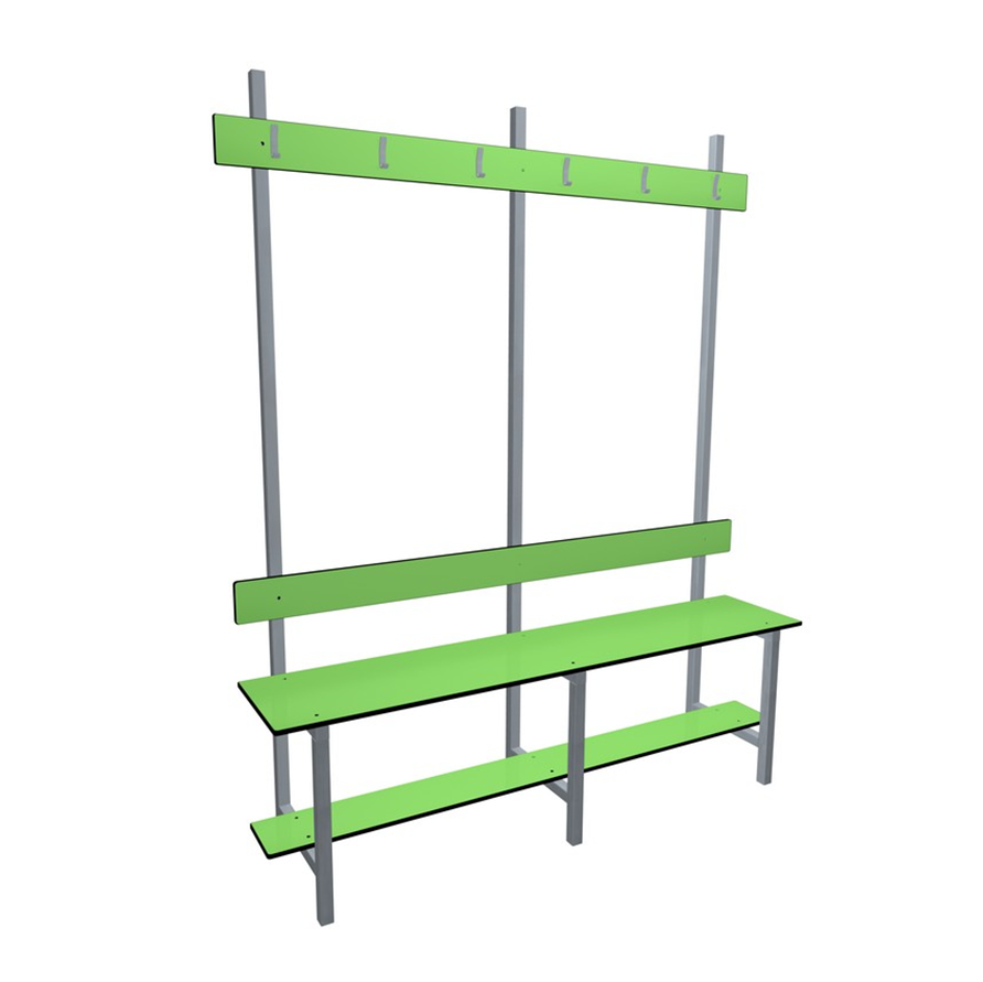 Banc de vestiaire double avec assise, repose chaussures, dossier, porte-manteaux